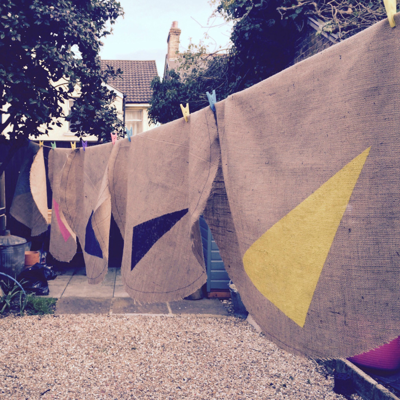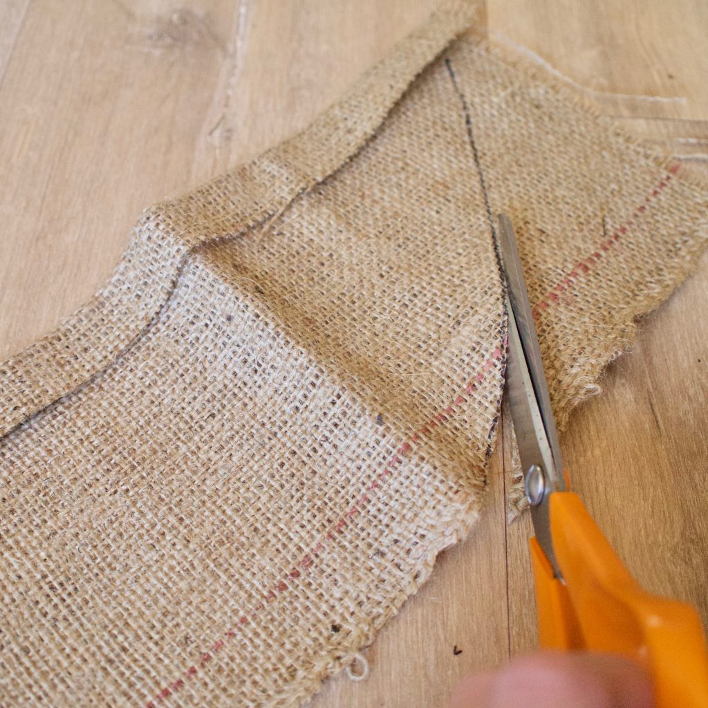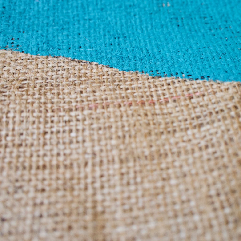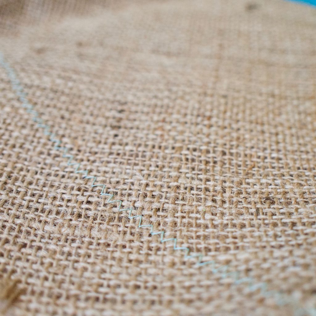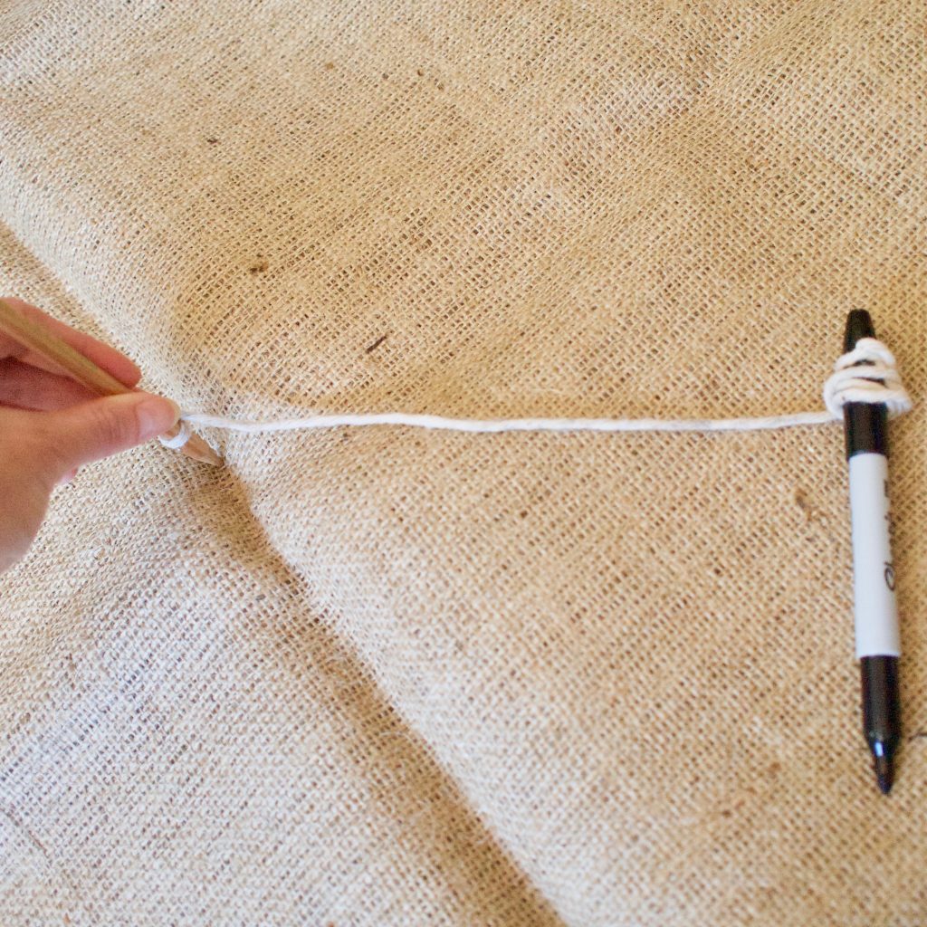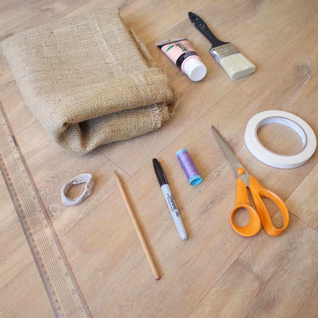 Method: Cut a 1x1m square out of the hessian material. Cut a length of 60cm twine, tie a pencil on one end and a Sharpie pen on the other – making sure there is 50cm in between the two. Measure 50cm (into the middle of the square) and place the pencil in the middle. Then draw a circle using the taught twine and Sharpie. Cut the circle out of the material.