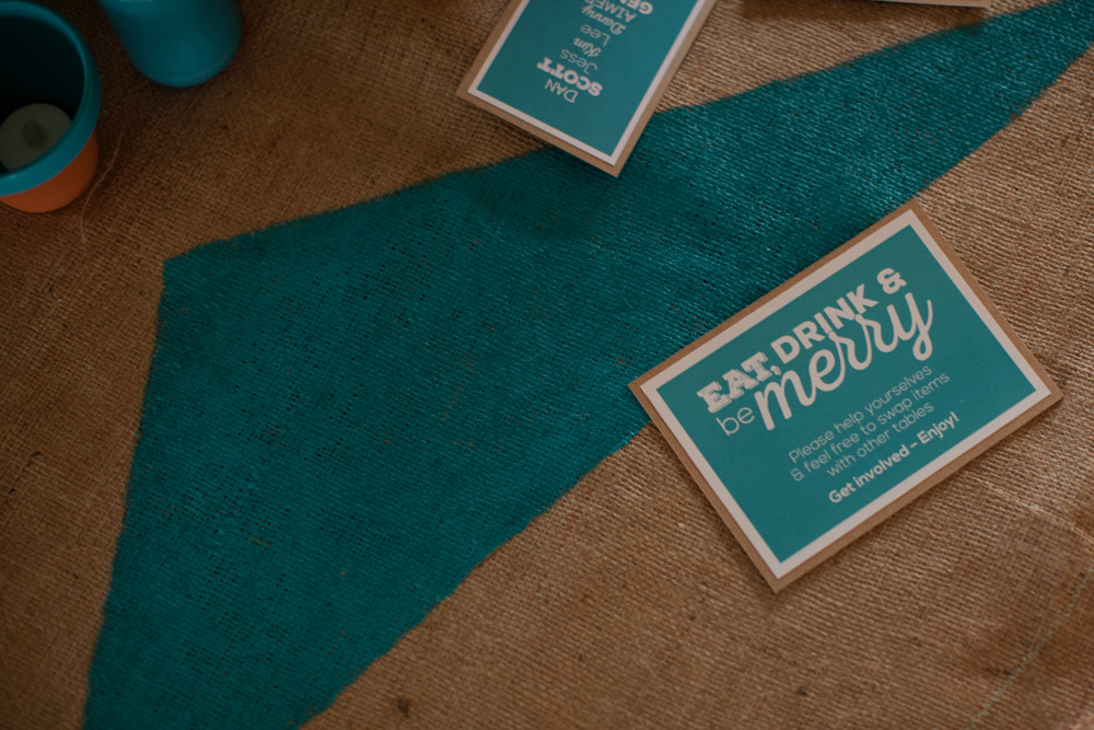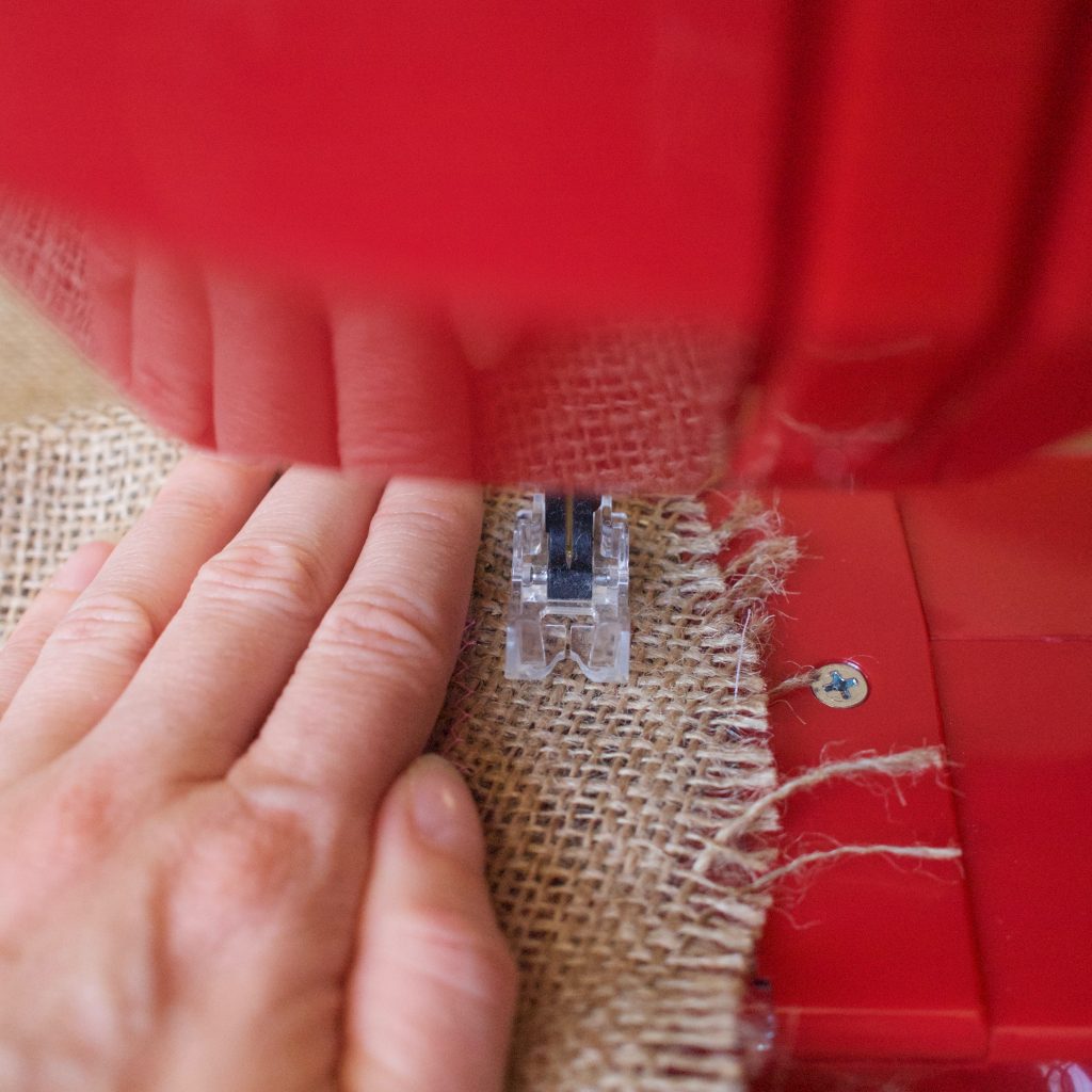 Next, choose the coloured thread you’d like to use and thread into the sewing machine. Sew 1cm around the edge using the zigzag stitch to avoid any of the material fraying. You can then add an extra personal touch by adding painted shapes, letters or numbers in the colours from your wedding. Simply mask off the area you’d like to paint with the masking tape. Using the paintbrush, dab the paint on and leave to dry before removing the tape.